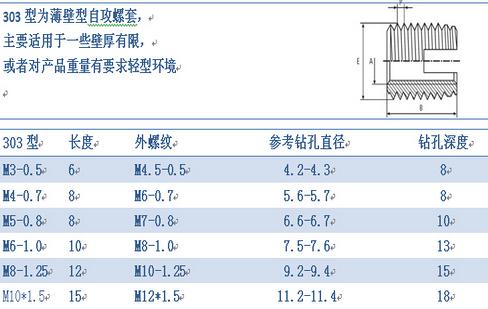 薄壁型蚌埠自攻螺套外观上看主要有两种区分,一种是一端开槽型的,另一种是一端三圆孔型的,其中开圆孔型的又分为307型和308型两种,307型和308型外观主要区别就是同一直径下,长度和外径大小有所区分。以上各种型式螺套均具有自行攻牙功能。